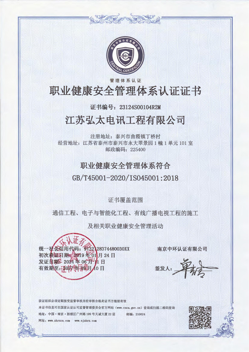 职业健康安全管理体系认证证书